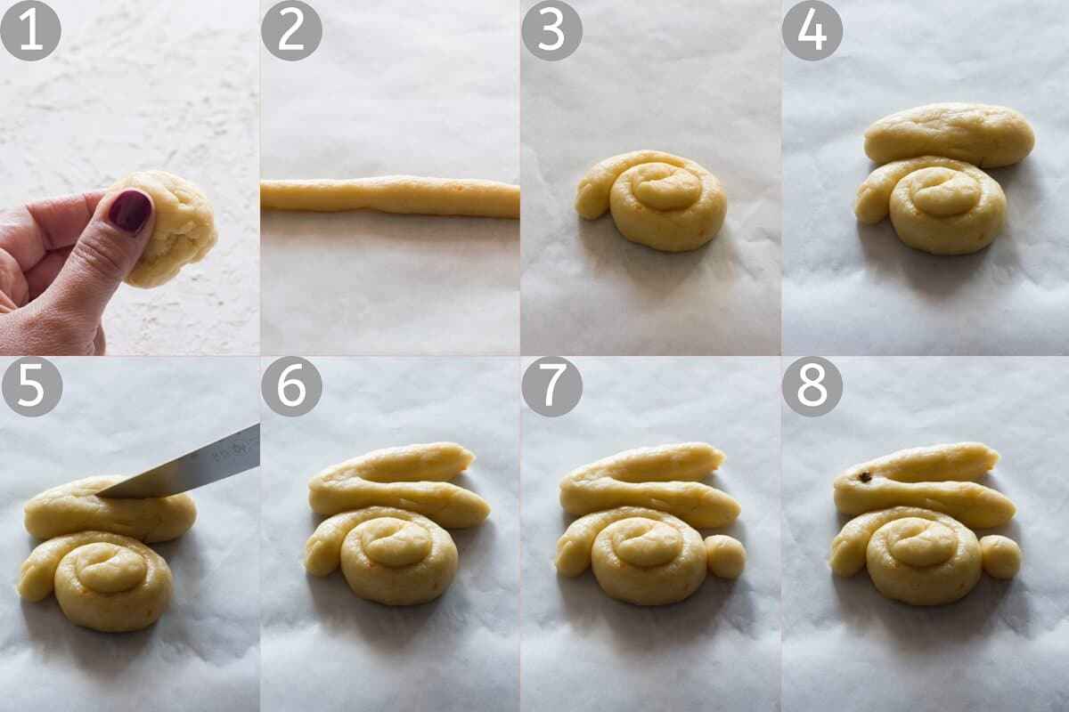 These bunny-shaped koulourakia are fun to make and perfect for Easter. Follow the simple steps below to shape the dough into cute bunny cookies.